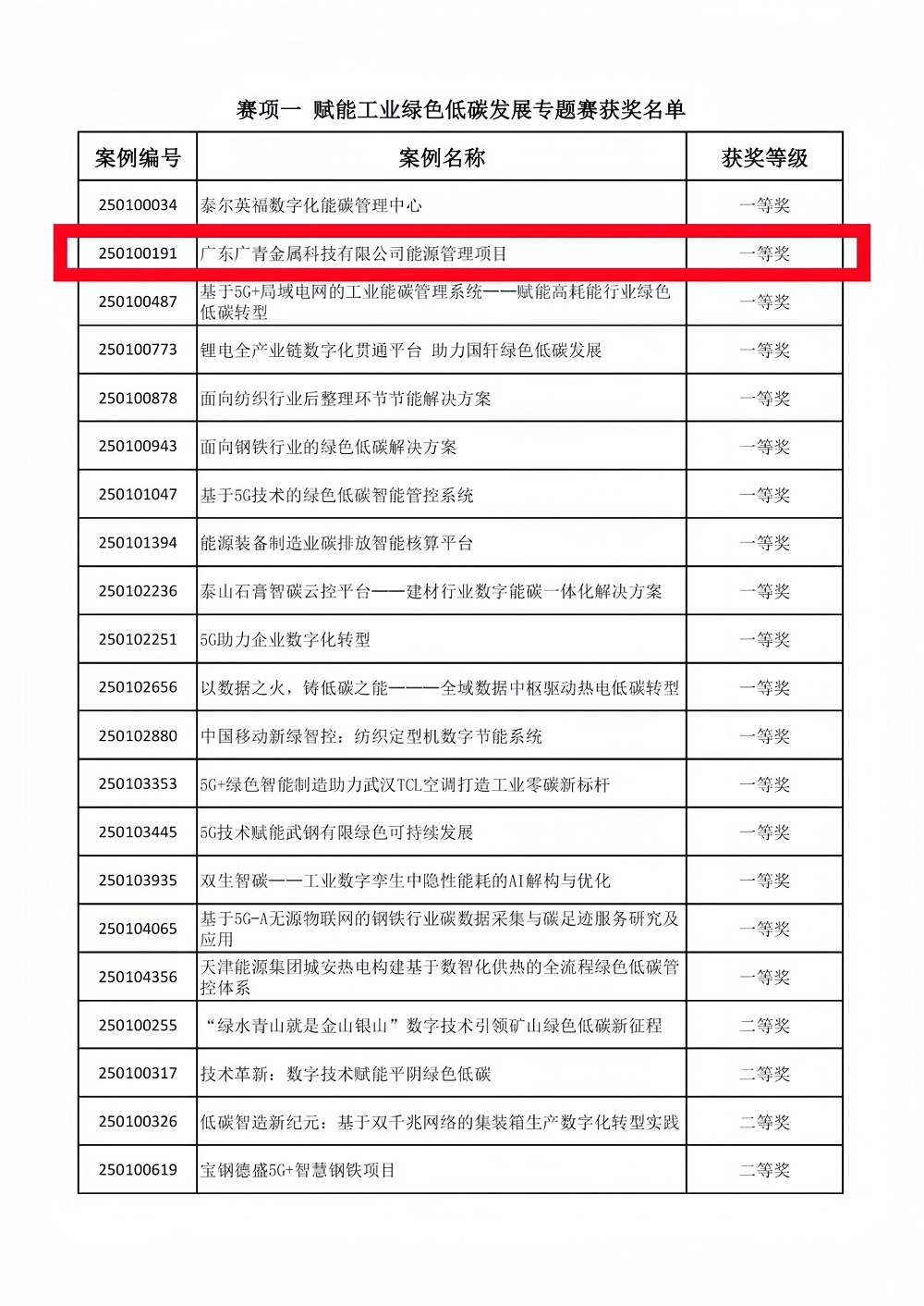 近日,第三届“新绿杯”信息通信行业赋能碳达峰碳中和创新大赛全国专题赛获奖名单公布,广东广青金属科技有限公司能源管理项目荣获“赋能工业绿色低碳发展”专题赛一等奖。