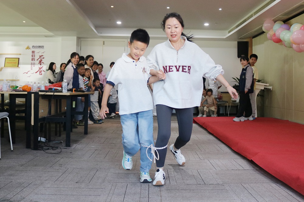 13时,亲子活动在童趣盎然的音乐中拉开帷幕。创意设计的亲子项目依次展开:孩子们化身灵巧的“小青蛙”,在家长抛出的项圈间轻盈起落,脚下生风时总伴着尖叫与欢笑;“气球亲子乐”环节“彩蝶”在背靠背的默契传递中翩然舞动,延展成温馨画卷;“两人三足”绑腿并进,口号声中步伐渐齐,印下并肩的足迹。