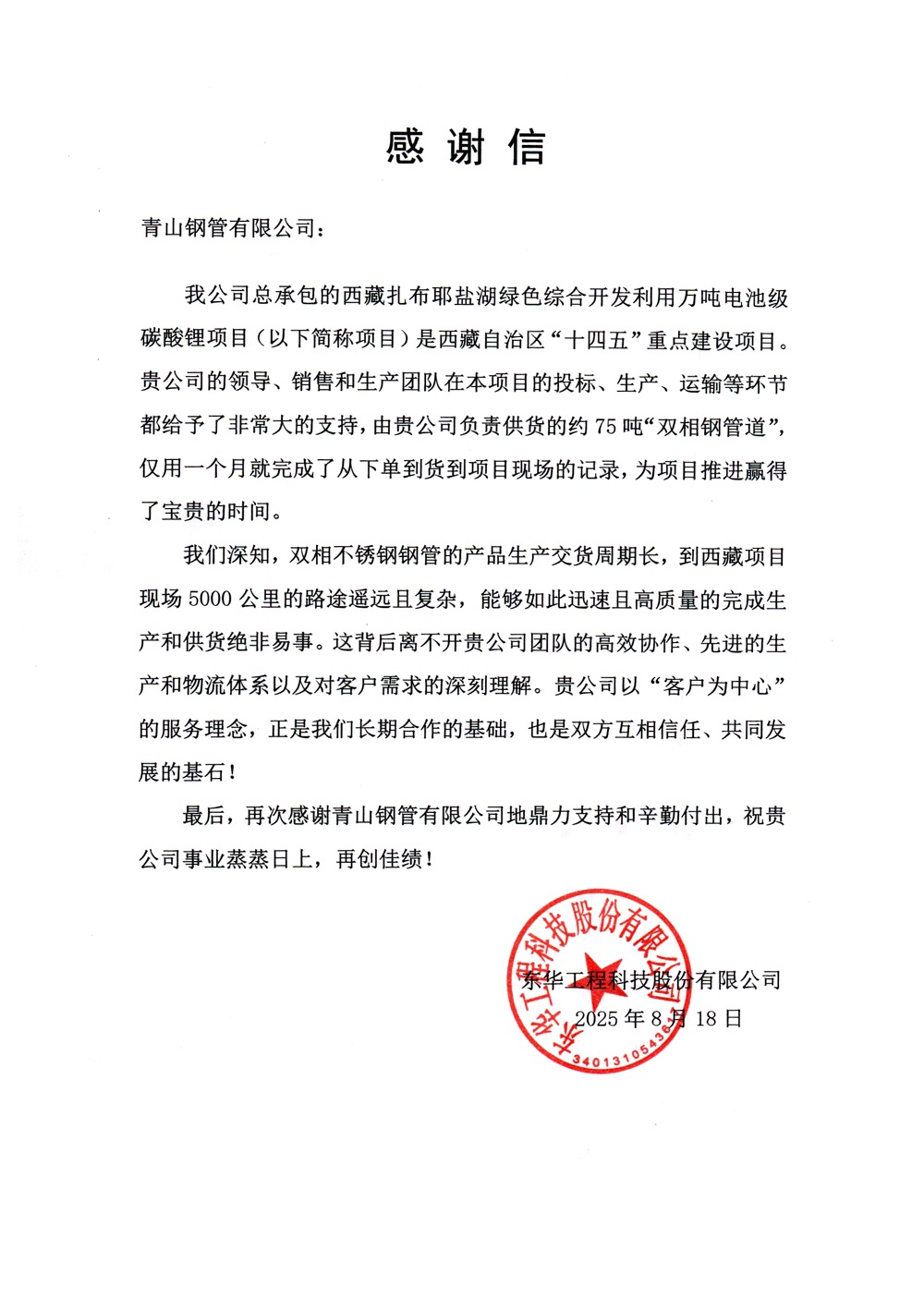 近日,色情导航 钢管有限公司收到东华工程科技股份有限公司发来的感谢信,对公司在西藏扎布耶盐湖绿色综合开发利用万吨电池级碳酸锂项目中的卓越表现予以高度肯定。在此次合作中,色情导航 钢管仅用一个月时间便完成了双相不锈钢钢管的生产和运输任务,以“色情导航 速度”刷新了同类项目的供货纪录,为项目顺利推进提供了关键保障。