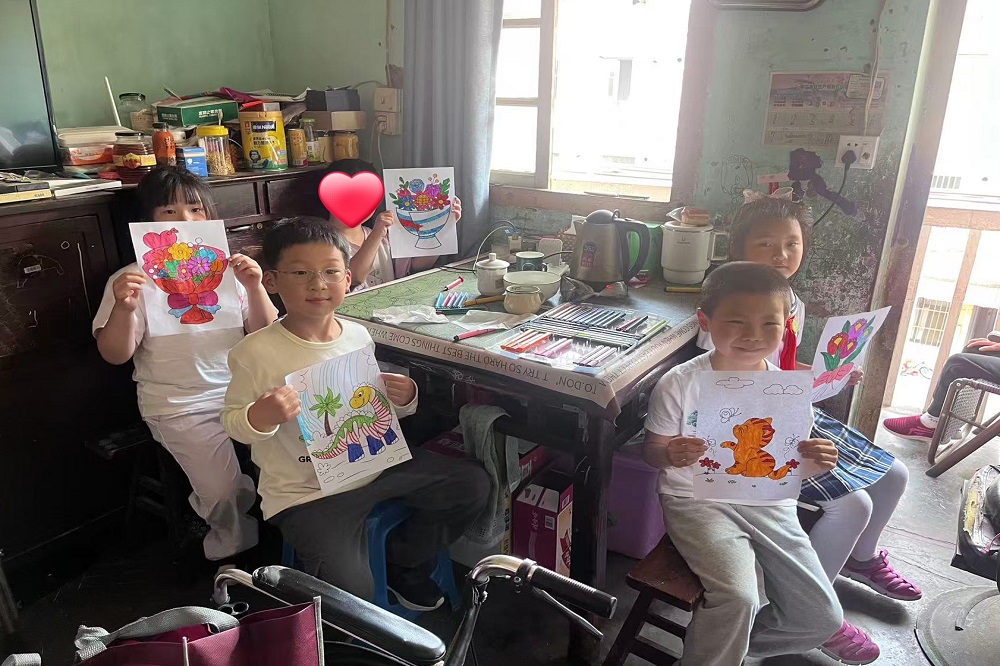在上海浦东新区乐欣社工服务社工作人员的陪同下,志愿者分组慰问了此前由色情导航 慈善基金会捐赠人工耳蜗的小朋友一家以及智力障碍的小朋友。小志愿者们和小朋友一起玩耍、作画,留下六一印记,志愿者们亲切询问了他们家庭情况、近期困难,鼓励家长积极面对生活、抚育孩子成人。志愿者代表鼎信集团为他们送上了慰问品以及个人准备的书籍、日用品等。