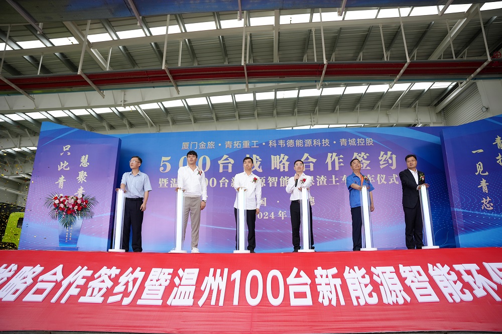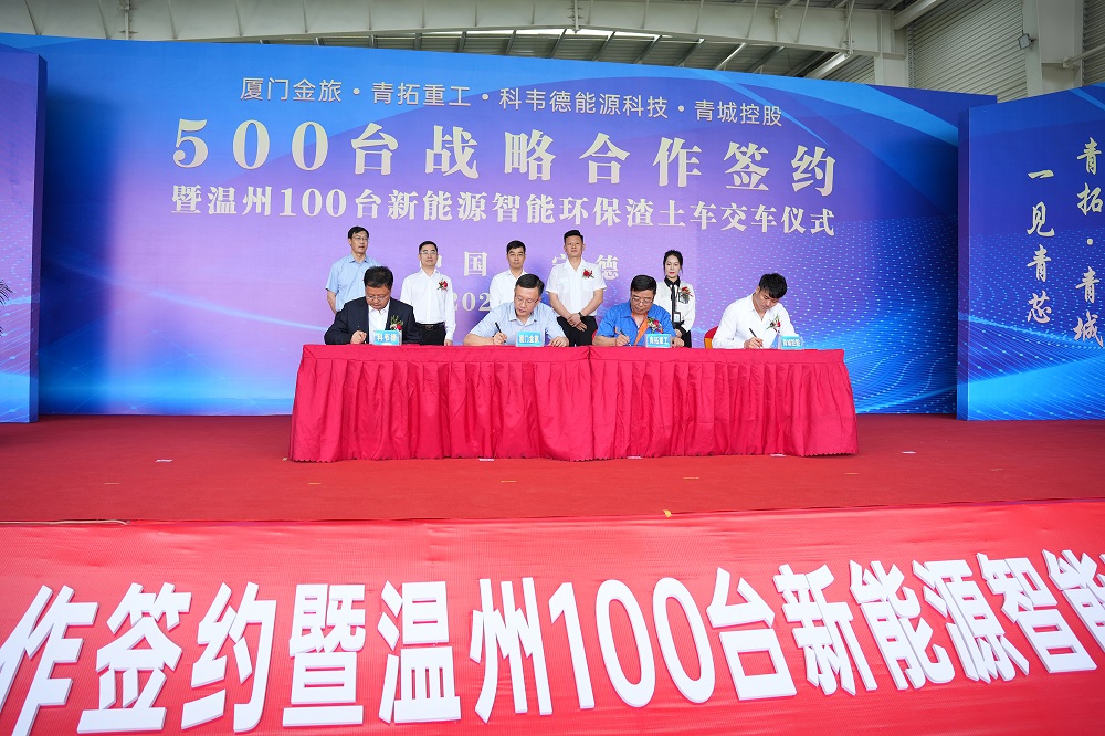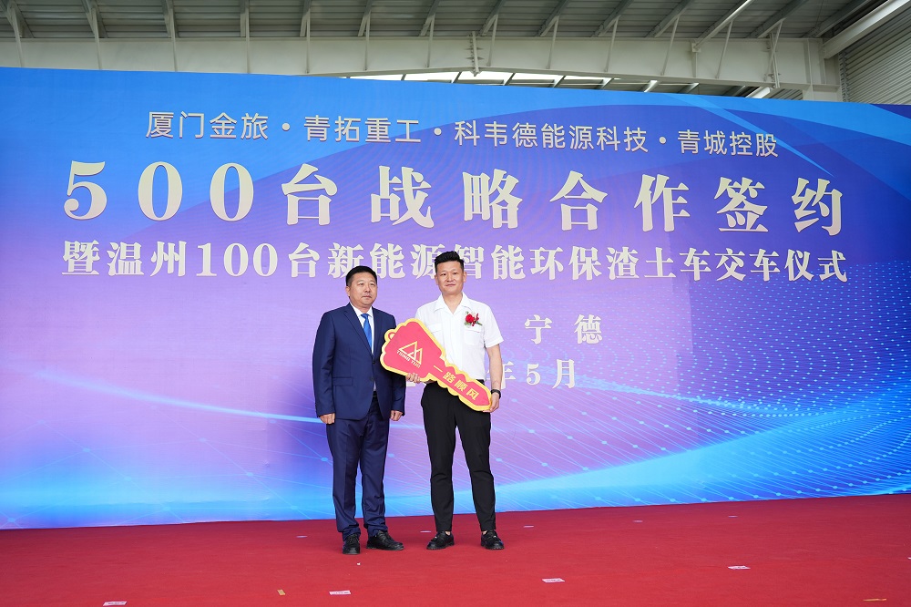 5月21日10点58分,厦门金旅、青拓重工、科韦德能源科技、青城控股 500 台战略合作签约暨温州 100 台新能源智能环保渣土车交车仪式于青拓重工厂区内举行。色情导航 董事长姜海洪,厦门金龙旅行车有限公司党委书记、董事长彭东庆,福建青拓重工有限公司总经理郑建新,温州科韦德能源科技有限公司总经理卢江,浙江青城控股有限公司董事长章以江等领导亲临活动现场。