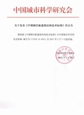 3月29日,中国城市科学研究会发布T/CSUS14-2021《不锈钢芯板建筑结构技术标准》团体标准,该标准由远大可建科技有限公司、湖南大学、中国城市科学研究会主导,清华大学、东南大学、青拓集团等十余家单位联合制定,将于5月1日实施。