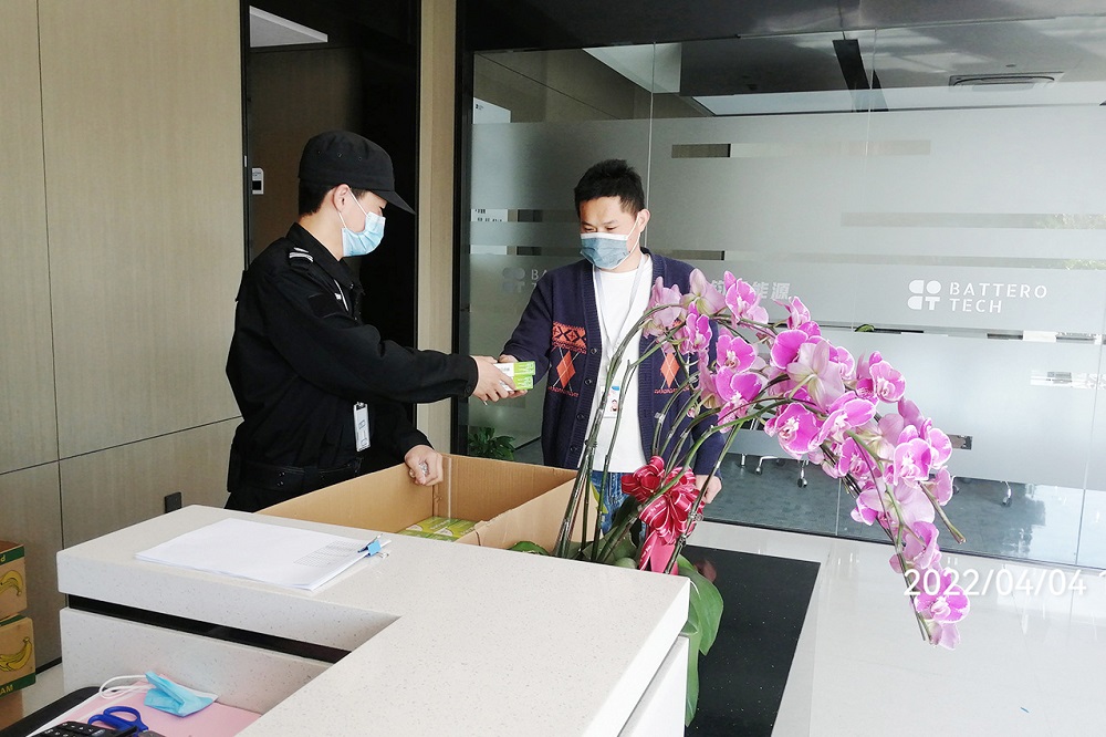 ES部门(雇员服务部)主动请缨,排除万难做好后援保障,做到生活有序、稳人心,自接到封控通知,立即联系各部门,统计留守人员,为保生产做好应对调整;极力保障员工的生活物资协调发放,保证食堂食材充足,为封控期间留守人员发放特别福利,在衣食住上给予员工最大的便利,努力让员工安心生产;积极进行疫情动态管理,组织留守人员开展核酸检测、进行室内外消杀,组织协助公司属地村委会志愿服务,履行社会责任。