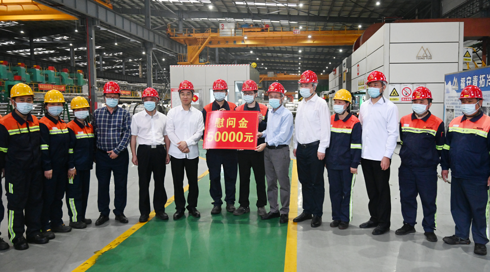 张永宁一行走进青拓冷轧科技车间,为荣获“全国劳动模范”荣誉称号的福建青拓特钢技术研究院首席工程师周小明和其他职工代表们送上节日问候与慰问金,并与他们亲切交谈,详细询问他们的日常生活和工作情况,叮嘱员工们在辛勤工作的同时要注意自身的安全和疫情防护,传达了政府的关爱之情和温暖心意。