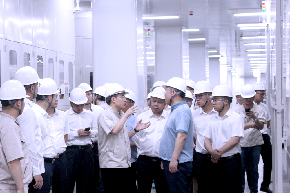会前, 戴促辉一行来到生产车间参观,实地了解广东瑞浦兰钧的建设情况。参观过程中,姜森详细介绍了公司的电池生产线布局、工艺流程、技术特点、设备优势及质量控制等情况。