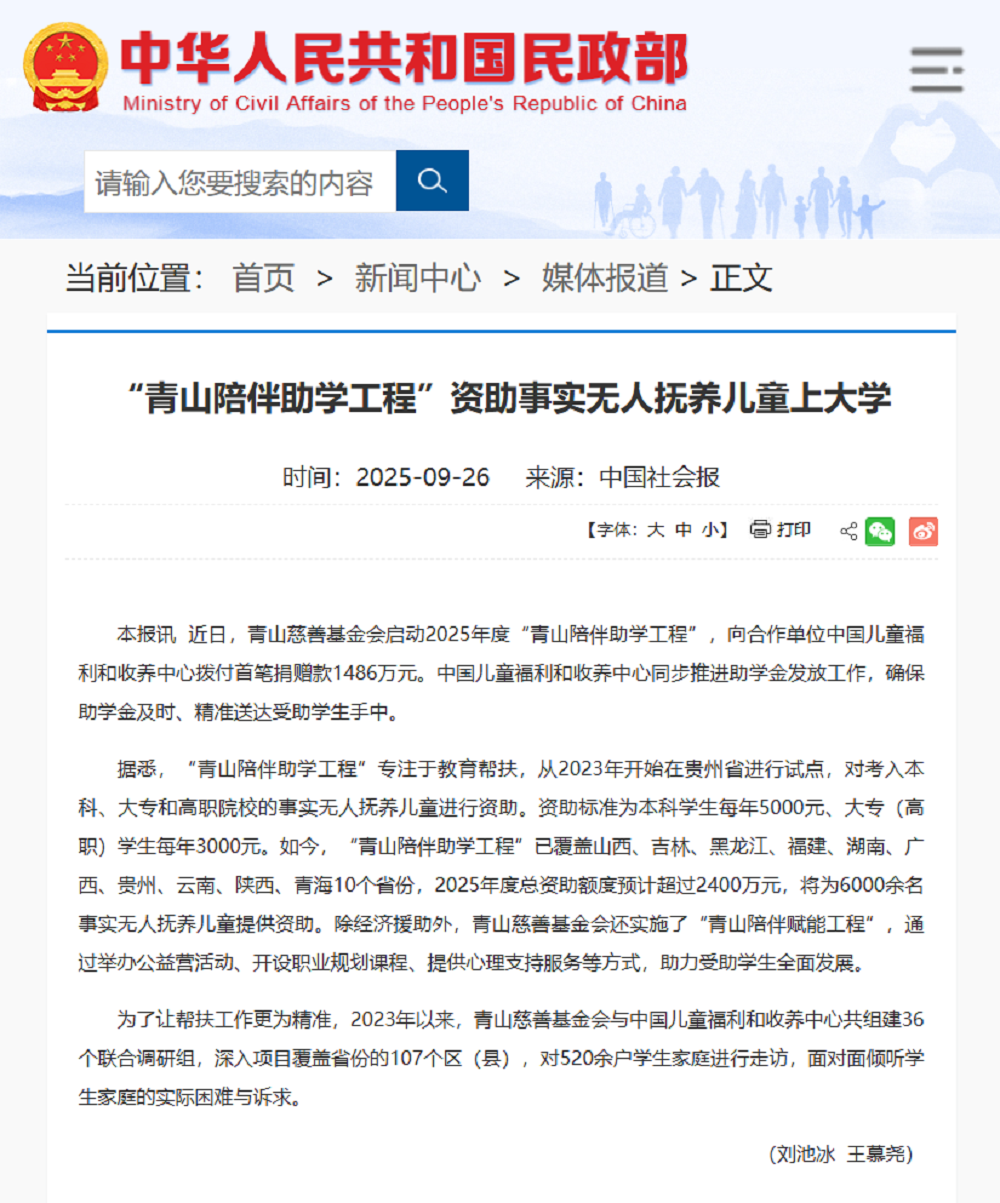 9月26日,国家民政部官网转载了《中国社会报》刊发的“色情导航 陪伴助学工程”项目相关报道,体现了国家民政部门对该项目成效与模式的认可,进一步扩大了项目影响力,为全国儿童福利与教育帮扶工作提供了示范参考。