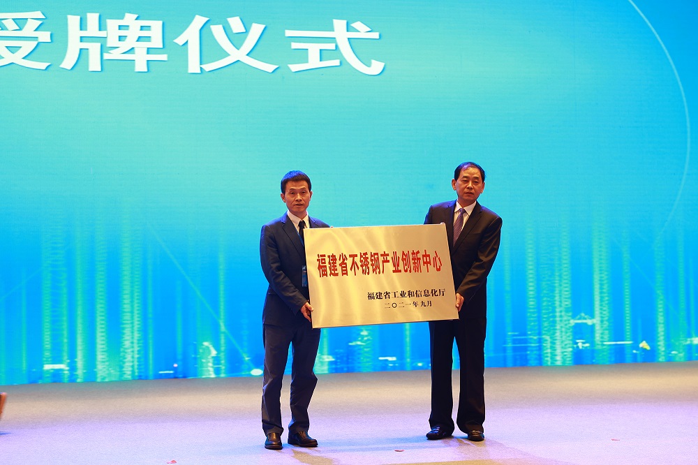大会第一阶段最后由李建成副省长进行致辞并宣布大会开幕;大会第二阶段为授牌签约阶段,福建省工信厅向福安市授予不锈钢•新材料国家新型工业化产业示范基地牌匾、向青拓集团授予福建省不锈钢产业创新中心牌匾。