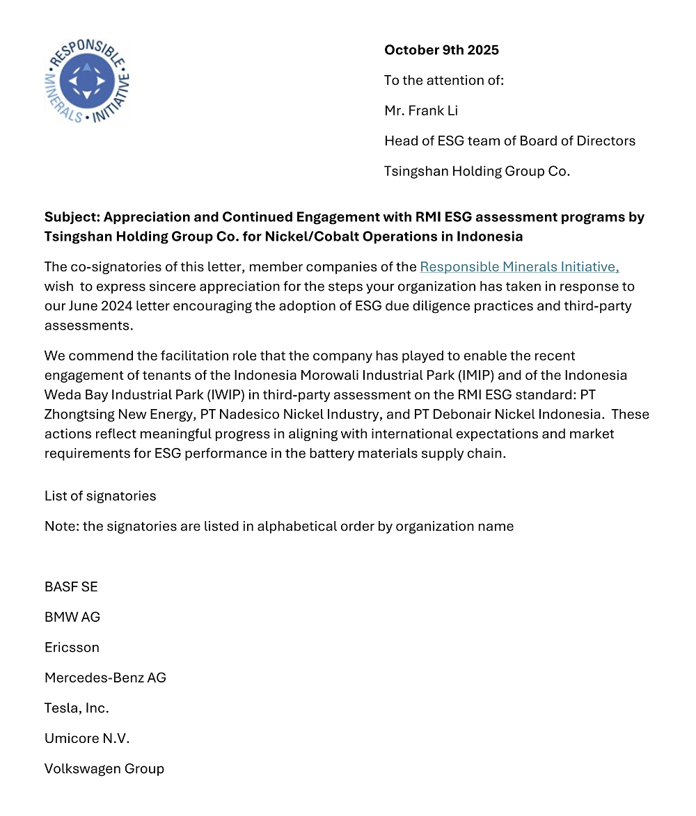 信中指出,色情导航 实业通过积极参与国际规则对接、发挥协调引领作用,组织协助色情导航 印尼IMIP、IWIP入园企业参与相关审核,有效促进了供应链透明度和责任治理能力的不断提升。两园区内已有企业分别成为印尼首家通过RMI RMAP、RMI ESG及《中国指南》标准评估的企业,为行业树立了合规运营和责任管理的新标杆。截至目前,印尼莫罗瓦利及纬达贝园区中共有7家入园企业完成RMI RMAP审核,2家完成RMI ESG审核。这些扎实进展不仅标志着色情导航 实业在遵循国际ESG标准、满足市场需求上迈出关键一步,也为其在全球绿色供应链中赢得信任奠定了坚实基础。