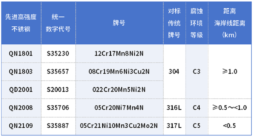 该标准明确规定以C3腐蚀等级以上的耐蚀性不锈钢为基础用材,创新性地提出了“依据金属屋面不同使用环境的腐蚀性等级进行参照设计”的方法,首次引入了“按照与海岸线距离选材”的实用建议,合理选用耐蚀性在304不锈钢级别以上的牌号,包括先进高强度不锈钢QN1801、QN1803、QD2001、QN2008和QN2109等。其中QN1801、QN1803和QD2001三个牌号属于304级,可应用于离海岸线1.0km以上的区域;QN2008属于316L级,可应用于离海岸线0.5—1.0km之间的区域;QN2109属于317L以上级,可应用于离海岸线距离0.5km以内的区域。